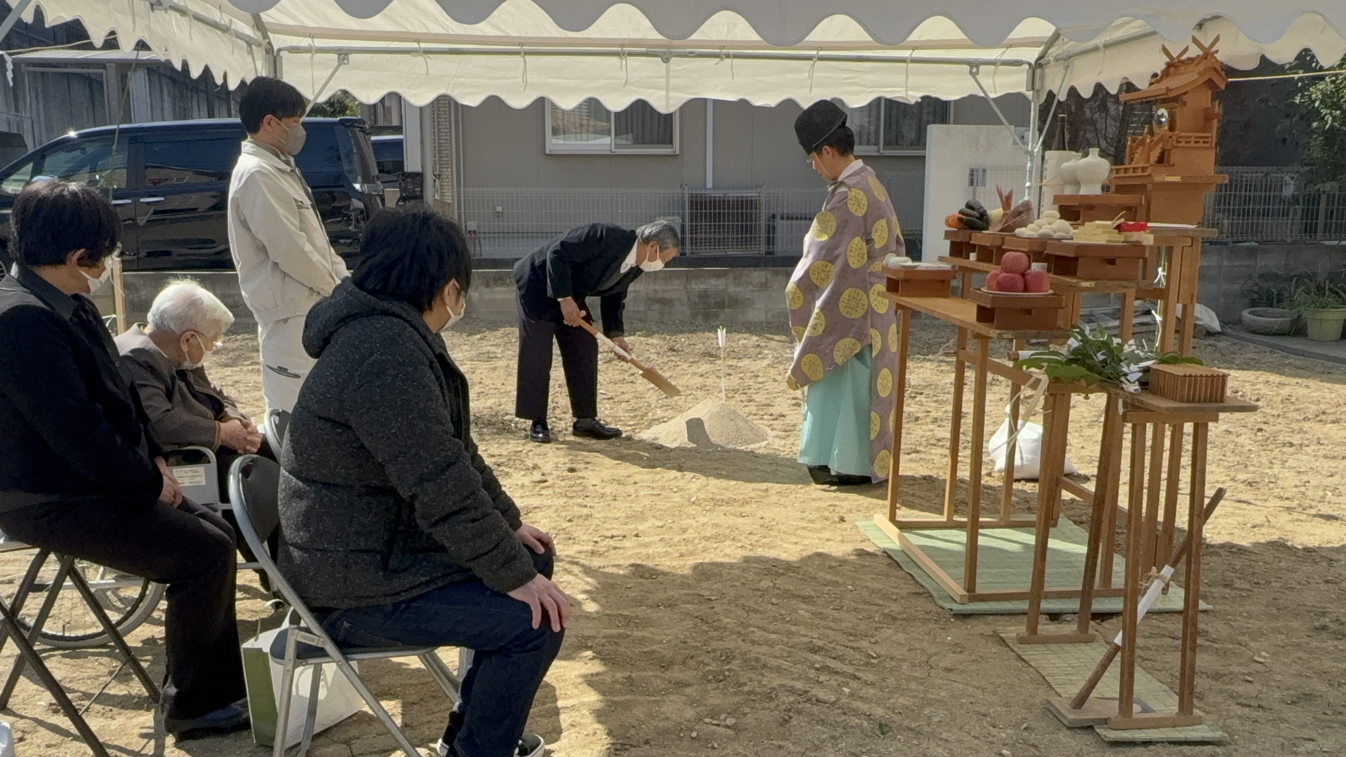 敷地の平安と工事の安全を祈るため、新しく建物を建設する前に行う儀式で、その土地に建物を新しく建築すること、そこに住むことを地主神に報告します。