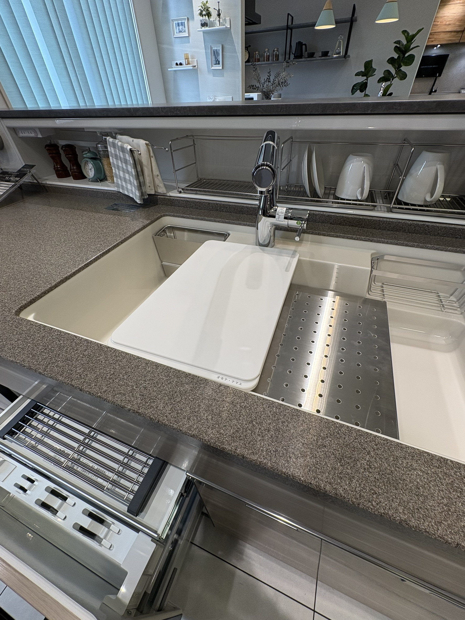 3段構造となっており、1段目にはアシストスペースといい、まな板や水切りを設置してシンクの上でも調理ができるスペースとして活用できます。